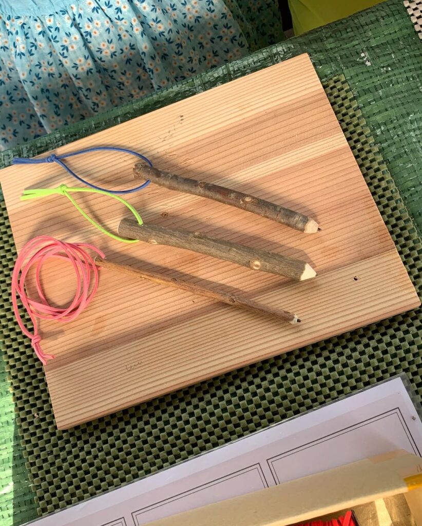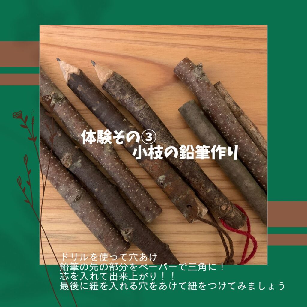 「小枝の鉛筆づくり」では、参加された皆さんに機械の操作を体験していただき、鉛筆の芯を入れる穴開けをされました。中には初めての操作で緊張された方もいたそうですが、「身近にある材料」を使って簡単にできることを伝え、「自分の家の庭の小枝や思い出の木を使ったりして、思い出して作って頂けると嬉しい」というお考えのようです。