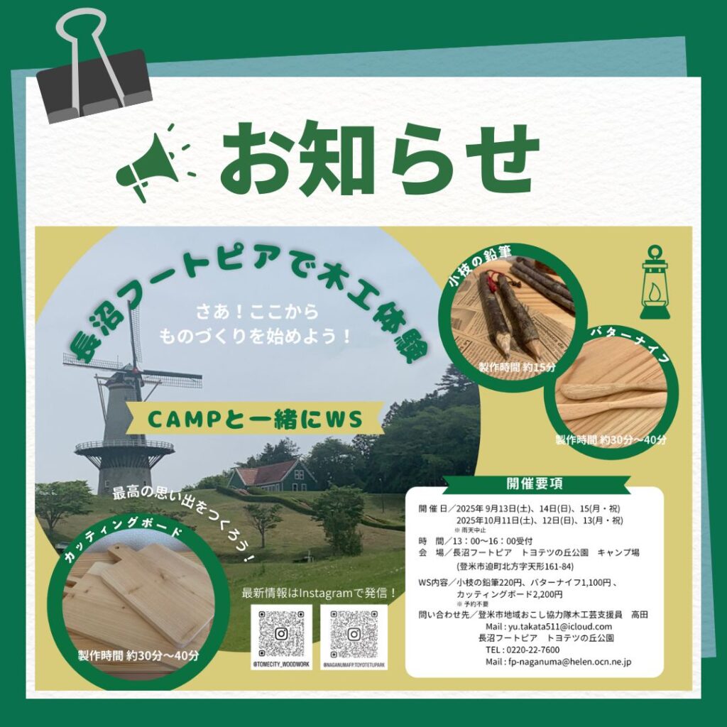 私が個人的に注目していた9月の活動は、長沼フートピア公園トヨテツの丘公園キャンプ場で開催された木工ワークショップです。